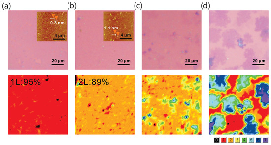 Morphologies and layer distributions of various few-layer graphene samples segregated from a Cu/Ni alloy at 900 °C after being transferred to a 300 nm SiO2/Si substrate. The upper part shows optical microscopy (OM) images of graphene samples corresponding to the different Ni atomic percentages in the alloy: (a) 5.5%, (b) 10.4%, (c) 18.9%, and (d) 100%. The insets in (a,b) show the corresponding atomic force microscopy (AFM) images. The lower part presents layer distributions determined by a red–green–blue (RGB) color analysis of the OM images. Different colors in the bottom right corner indicate the layer thicknesses according to the provided color code. Reproduced from [47]. Copyright 2011, American Chemical Society.