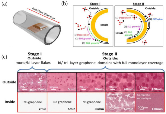 (a) Illustration of a sample grown in parallel in a quartz tube, showing both flat and enclosure regions. (b) Growth mechanism of the bilayer graphene on the outside surface: stage I depicts the growth when the monolayer graphene is incomplete, while stage II represents the growth after the completion of the monolayer graphene at the outside surface. (c) Time-dependent graphene growth on both sides of the Cu enclosure. Graphene is transferred onto the SiO2/Si substrate for improved imaging, with different shades of pink representing the varying thicknesses of graphene. On the inside surface, after 60 min, graphene monolayer flakes with bi/trilayer regions are observed. After 120 min, the monolayer graphene film growth is completed on the inside, while the bilayer growth on the outside seems to reach saturation. The graphene growth process is categorized into two stages based on the completeness of the monolayer growth on the outside surface of the Cu enclosure. Reproduced with permission from [35]. Copyright 2014, American Chemical Society.