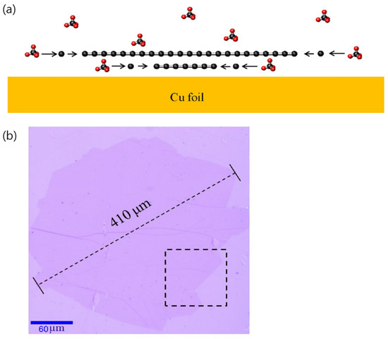 - Wu, T.; Zhang, X.; Yuan, Q.; Xue, J.; Lu, G.; Liu, Z.; Wang, H.; Wang, H.; Ding, F.; Yu, Q. Fast growth of inch-sized single-crystalline graphene from a controlled single nucleus on Cu–Ni alloys. Nat. Mater. 2016, 15, 43–47. [Google Scholar] [CrossRef]