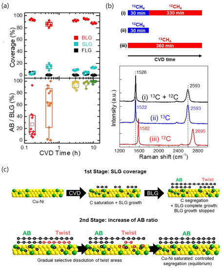 Cu/Ni alloys yield highly uniform AB-stacked bilayer graphene under optimized growth conditions. AB-stacked bilayer graphene with a yield of 99.4% was achieved on sputtered Cu/Ni alloy thin films [56]. Graphene grown on a single-crystal Cu/Ni(111) alloy foil with a Ni concentration of 16.6 at.% yields AB-stacked bilayer graphene with a yield of ~100% [27]. Ago et al. proposed a growth mechanism of AB-stacked bilayer graphene on Cu/Ni alloy surfaces with a high yield [56]. The AB stacking ratio of the bilayer graphene on Cu/Ni alloy thin films strongly depended on the growth period. A short growth period (10 min) resulted in bilayer graphene with an AB stacking ratio of only 27%. However, as the growth period was extended to 3 h, the AB stacking ratio increased largely (>90%). The AB stacking ratio increased to 99.4% after 10 h of growth (Figure 6a). Notably, according to the isotope labeling of the growth of BLG, no new carbon atoms were incorporated from the gas phase after the first 30 min of growth (Figure 6b). This observation suggests that the observed structural reconstruction of the bilayer graphene and increase in the AB stacking ratio were not due to the exchange of carbon atoms from the gas phase. Instead, it was proposed that the structural reconstruction of the bilayer graphene and the increase in the AB stacking ratio were achieved through carbon dissolution–segregation processes, which were assisted by the catalyst. The results suggested that the preferential dissolution of the energetically unfavorable twisted bilayer graphene in the Cu/Ni alloy was followed by the segregation/precipitation of carbon atoms from the saturated Cu/Ni alloys, leading to the formation of the stable AB-stacked bilayer graphene (Figure 6c).