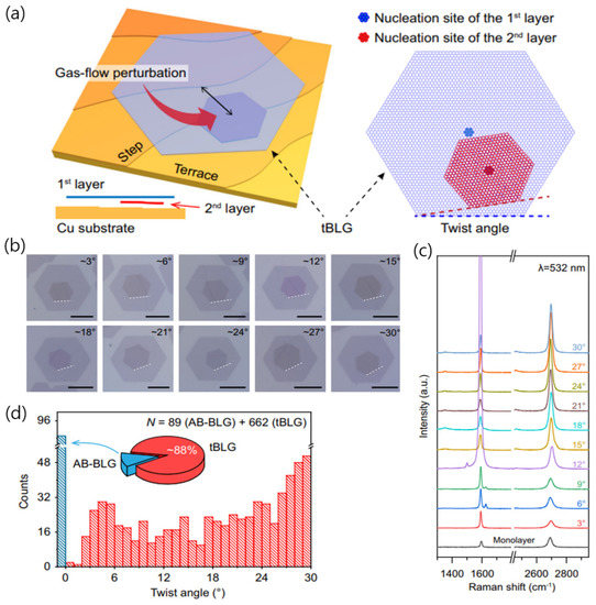 A recent study provided a synthesis method for twisted bilayer graphene, referred to as the hetero-site nucleation strategy (Figure 7a) [64]. If the microscopic environments during the nucleation of the first and second graphene layers are the same, the resulting bilayer graphene has AB stacking configuration. However, by introducing a gas-flow perturbation to initiate the nucleation of the second layer after the first layer has formed, the environment at the time of nucleation can be different, resulting in a nucleation site distinct from the first layer (hetero-site nucleation) (Figure 7b,c). This process also creates a difference in the local environment for the graphene nuclei, including the properties of the underlying Cu surface, which enables the formation of twisted bilayer graphene. Without hetero-site nucleation, only 16% of the bilayer domains had a twisted structure, while this fraction increased to 86% when hetero-site nucleation was used (Figure 7d).