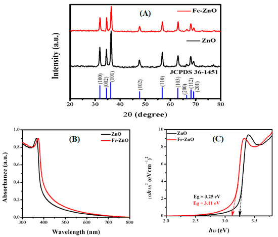 Figure 1. (A) XRD spectra of pure and Fe-ZnO NPs; (B) UV-visible absorption spectra of pristine ZnO and Fe-ZnO NPs; (C) Tauc plots of ZnO and Fe-ZnO NPs.