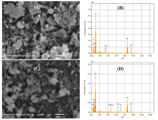 The surface properties of pristine and doped ZnO samples were determined using SEM analysis (Figure 2A,C). SEM images of ZnO NPs (Figure 2A) display the agglomeration of NPs having irregular morphologies. The NPs aggregated to form sheet-like aggregates, in addition to spherical shapes, which are in minor numbers. However, the Fe-ZnO sample shows less aggregation of NPs having quasi-spherical morphology (Figure 2C). In addition to reduced agglomeration, a decrease in particle size can be visualized; however, exact particle size determination is a strenuous task owing to particle aggregation.