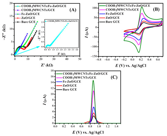 To probe the voltammetric behavior of bare and modified GCEs, cyclic voltammetry was executed by using 5 mM K3[Fe(CN)6] as a redox probe and 0.1 M KCl as an inert electrolyte at a 0.1 Vs−1 scan rate in the potential window from −0.2 V to 0.7 V. Figure 3B shows the electrochemical responses of bare GCE and modified GCEs, which shows an increase in current responses in comparison to bare GCE. Cyclic voltammograms reveal that the anodic peak on COOH-fMWCNTs/Fe-ZnO/GCE shifted towards lower potential of 217 mV in comparison to 268 mV, 263 mV, 258 mV, and 222 mV of bare GCE, ZnO/GCE, Fe-ZnO/GCE, and COOH-fMWCNTs/GCE with significant enhancement of peak current. A decrease in peak separation ∆Ep = 65 mV was observed for COOH-fMWCNTs/Fe-ZnO/GCE compared to others. The shift of the peak potential towards a lower value, improvement in reversibility, and remarkable increase in current show that the modified electrode eases the redox processes.