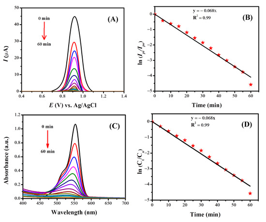 Figure 6. (A) SWVs of ST photodegradation recorded at various times using designed sensor; (B) kinetics plot of photodegradation of ST constructed from SWV data; (C) UV-visible monitoring of photocatalytic degradation of ST; (D) pseudo-first-order kinetics plot of ST photodegradation.
