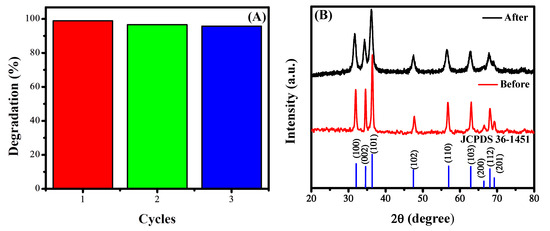 Figure 8. (A) Recycle catalytic performance of Fe-ZnO photocatalyst; (B) XRD pattern of Fe-ZnO recorded before and after the photocatalytic degradation of ST.