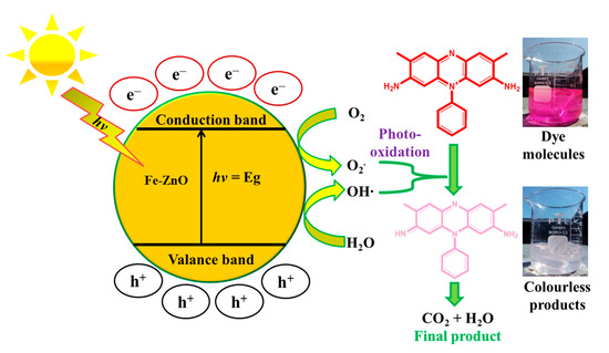 21. Nenavathu, B.P.; Kandula, S.; Verma, S. Visible-light-driven photocatalytic degradation of safranin-T dye using functionalized graphene oxide nanosheet (FGS)/ZnO nanocomposites. RSC Adv. 2018, 8, 19659–19667. [Google Scholar] [CrossRef] [PubMed]