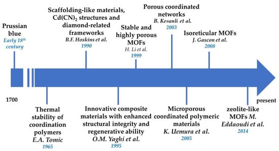 Historical trajectory of the MOFs’ evolution [,,,,,,,].