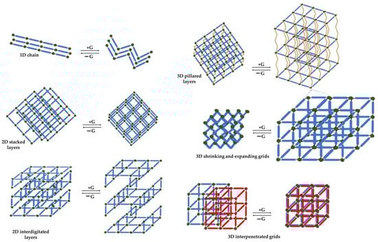 MOF dimensionality, where G stands for the guest molecules, green dots correspond to metal ions, blue lines indicate the organic linkers, yellow lines represent channels and red lines stand for different MOF motifs.
