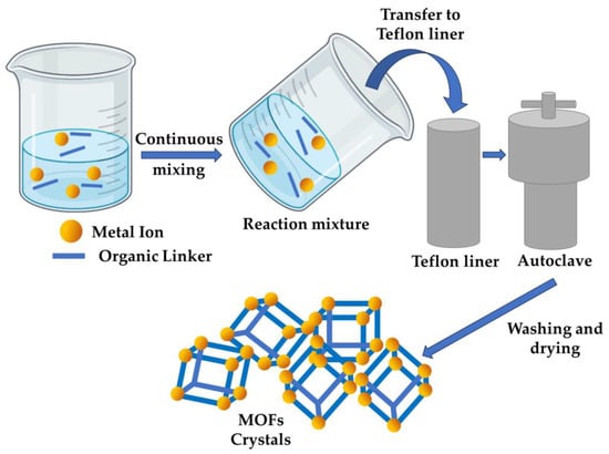 The hydrothermal approach, a variant of the solvothermal technique, employs H2O as a solvent []. According to this approach, both the precursor (metal ion), as well as the organic ligand, are solubilized within the solvent and consistently blended within a PTFE (polytetrafluoroethylene) liner. The mixture is then subjected to a reaction in an autoclave under predetermined settings regarding temperature, pressure, as well as duration []. When ongoing reaction is complete, the end products are cooled to room temperature and subsequently rinsed several times with distilled water to eliminate contaminants, yielding the aforementioned metal–organic frameworks (Figure 4). To obtain pure MOFs, synthesized MOFs undergo further purification, involving cleaning using a proper solvent, such as anhydrous ethanol, subsequently subjected to vacuum drying []. The solvents employed in the solvothermal procedure usually consist of exceedingly polar proton donors, characterized by elevated dielectric constants like CH3OH, CH3CH2OH, H2O, CH3COOH, C2H3N, DMS, DMF, and C3H6O [,]. An essential aspect of the solvothermal approach entails fine-tuning the reaction parameters, including temperature, duration, solvent selection, and solvent concentration []. The selection and concentration of chemical regulators directly impact crystallites’ type and size, which have been instrumental in producing extremely porous, chemically robust materials with unvarying structures in modern advancements [] (Table 1).