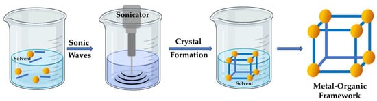 The sonochemical approach to fabricating metal–organic frameworks utilizes ultrasound radiation (20–10,000 kHz) (Figure 5). Similar to the microwave method, it offers a rapid, straightforward, low-temperature, and effective approach for developing MOFs with increased specific surface areas []. This approach relies on acoustic cavitation, where bubbles form and collapse in the solution, resulting in localized hotspots []. This process generates pressures of up to 1000 atm and temperatures exceeding 5000 °C in the cavitation zone, offering the necessary energy for the reactions’ conduction. Compared to hydrothermal and solvothermal approaches, the increased temperatures in sonochemical approaches promote swift chemical reactions, allowing for immediate crystal formation through uniform nucleation centers and decreasing both crystallization time and crystallite size.