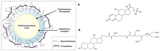 (Left): Schematic representation of the theranostic NBs developed in this work. (Right): Chemical formulae of prednisolone phosphate (A) and (B) the MRI agent Gd-DTPAMA-CHOL.