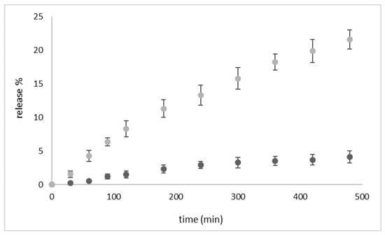 We analyzed the release profiles with different kinetic models (zero-order, first-order, Higuchi, and Korsmeyer–Peppas), and the Higuchi model showed by far the best performance, with the highest square correlation coefficient (R2) value (0.97) for both compounds. This result indicates that the release kinetics is controlled by diffusion through the polymer shell.