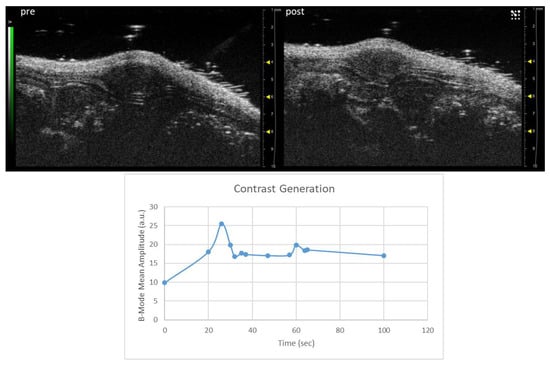 Ultrasound images were acquired in linear contrast mode, using a 40 MHz transducer, and following the changes in B-Mode amplitude over a total time of 2 min.