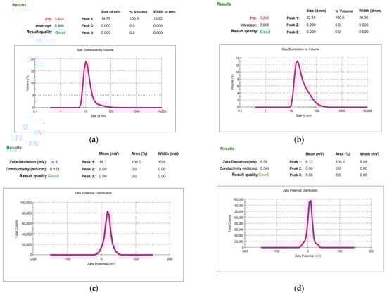 Particle size of aqueous solutions of compositions (a) NPh-Dox; (b) NPh-Dox-NGR. ζ-potential: (c) NPh-Dox; (d) NPh-Dox-NGR.