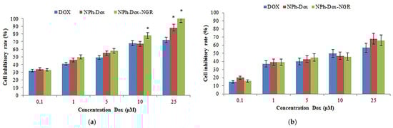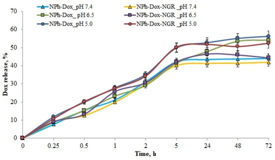The natural pH gradient is 5.0–6.5 in endosomes or lysosomes of tumor cells, and 6.5–7.2 in the tumor microenvironment [36]. Therefore, the conditions of drug release into the bloodstream and intracellular compartments of tumor cells in this experiment were simulated using pH 7.4, 6.5, and pH 5.0 buffer solutions. The results of Dox release from NPh-Dox-NGR and NPh-Dox NP compositions are shown in Figure 2.