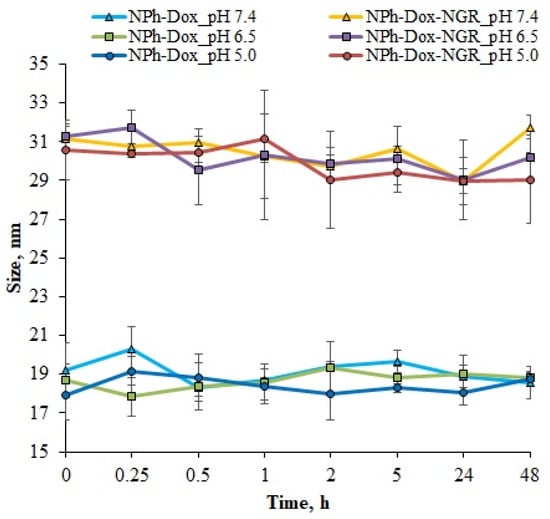 Samples of compositions NPh-Dox and NPh-Dox-NGR were diluted 10-fold with PBS with the appropriate pH environment (7.4, 6.5 and 5.0). Solutions were incubated at 37 °C. The particle size was measured on the Zetasizer Malvern ZS device at certain time intervals (0, 0.25, 0.5, 1, 2, 5, 24, and 48 h).