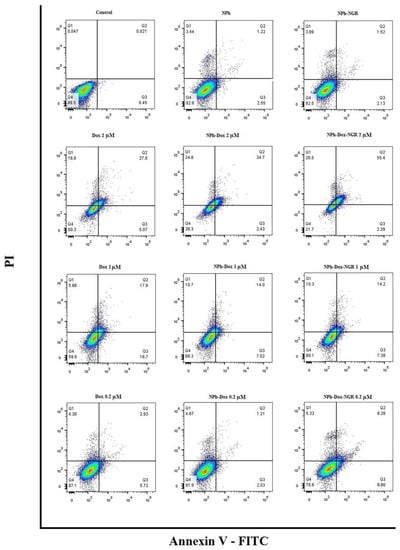 Analysis of apoptosis in HT-1080 cell culture incubated with phospholipid NPs (NPh), phospholipid NPs with the targeted peptide (NPh-NGR); free doxorubicin (Dox); phospholipid composition (NPh-Dox); and phospholipid composition with the peptide (NPh-Dox-NGR). Dox concentrations 2 µM, 1 µM, 0.2 µM. Quadrant design: upper left (Q1): necrosis, cells stained with PI; top right (Q2): late apoptosis; bottom right (Q3): early apoptosis, cells stained with annexin V; bottom left (Q4): fluorescent signal at the autofluorescence level of unstained cells.