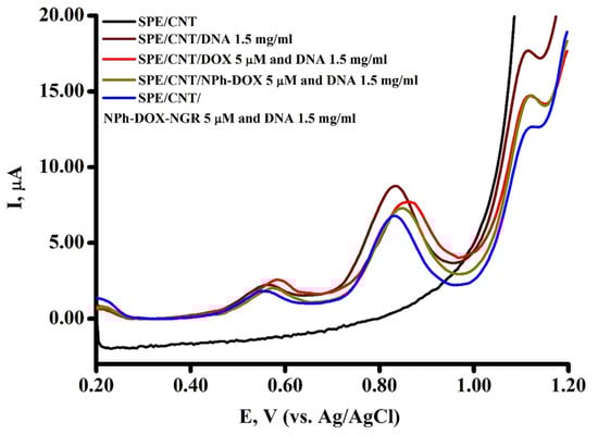 Comparison of the DPV effects of various dosage forms of doxorubicin on DNA on electrodes modified with CNT, where: (-) 1.5 mg/mL DNA, (-) 5 μM Dox and 1.5 mg/mL DNA, (-) 5 µM (NPh-Dox) and 1.5 mg/mL DNA, (-) 5 µM (NPh-Dox-NGR) and 1.5 mg/mL DNA, and (-) SPE/CNT.