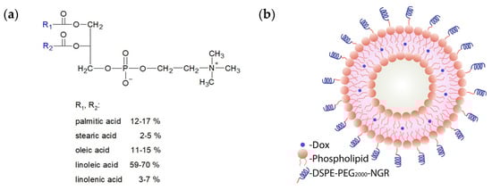 Structure of phosphatidylcholine (a) and model of Dox incorporated to a phospholipid system with peptides (b).