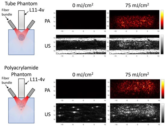 An illustration of the different phantoms with the corresponding ultrasound and photoacoustic images produced from each setup. Within the tube phantom, nanodroplets were suspended in water within the tubular void, while in the polyacrylamide phantom, the nanodroplets were embedded throughout the phantom.
