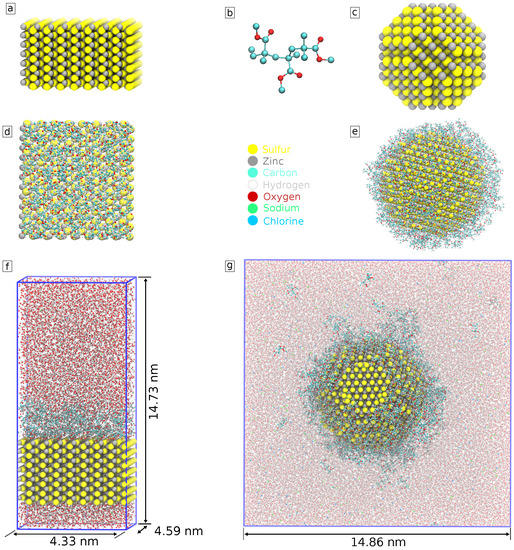 Model of (a) ZnS (110) slab; (b) PMMA; (c) ZnS nanoparticle; (d) coated slab of ZnS (110) (top view); (e) coated ZnS nanoparticle. The system used to simulate (f) coated with PMMA ZnS (110) slab and (g) coated with PMMA nanoparticle in the solution of water and ions.
