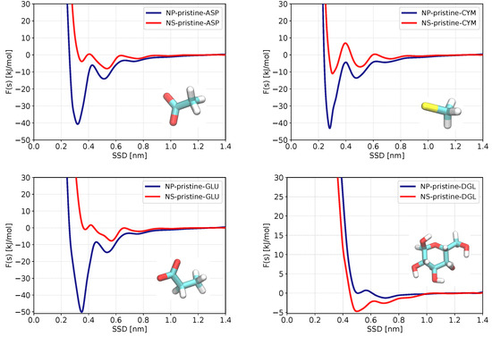 Considering strongly binding amino acids (Figure 3), we see that GLU and ASP have global PMF minima corresponding to direct binding in the case of the spherical surface, while in the case of planar surface strongest binding corresponds to a water-mediated mode. The situation is different for glucose, which shows the strongest binding to a planar surface in a direct mode of binding. Cysteine has the strongest direct binding mode both in the case of planar and spherical surfaces.