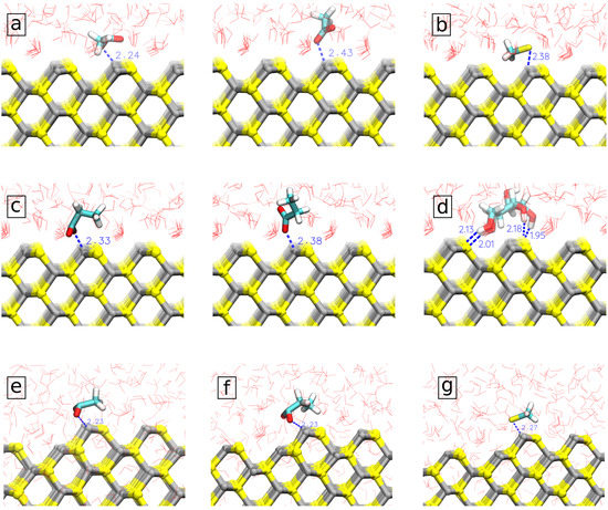 In order to understand large differences of strongly binding amino acids to spherical, respectively, planar surfaces, we analyzed in detail molecular configurations extracted from the MD trajectory considering cases when the sorbent was at the distance corresponding to the minimum of PMF. Typical configurations, including distances between important atoms, are shown in Figure 4. One can see that in the case of a planar surface, ASP and GLU bind to Zn atoms by only one of the oxygens of the COO group (Figure 4a,c), while they bind by both oxygen atoms to 2-coordinated Zn atoms, which are present at the edges of ZnS spherical nanoparticle (Figure 4e,f). Previously, Moloti et al. [71] suggested strong interaction of carboxylic oxygens of L-aspartic acid to ZnS nanoparticle from observation of the C-O peak appearance in the IR-spectra of L-aspartic acid-capped ZnS nanoparticle compared to pure L-aspartic acid. The difference in the adsorption free energy of ASP and GLU at slab and nanoparticle ZnS structures could be the result of difficulties to keep both oxygens at the planar surface while competing with water molecules at the surface. Of note, one can see ordered water structure in the first hydration layer at the planar ZnS surface (Figure 4a–d) while no such ordering is seen at the bent surface of the nanoparticle (Figure 4e–g). The difficulty in substituting strongly bound water from the first hydration layer is also likely the reason for the weaker binding of CYM to the planar surface compared to the nanoparticle where CYM can bind to 2-coordinated Zn atoms which do not have strongly bound water around.