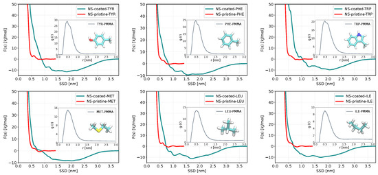 Free energy profiles as functions of the minimum distance between the center of mass of each biomolecule to the nearest C atom of the PMMA molecule (outer plots). The RDFs of each biomolecule to PMMA are shown in the inner plots.