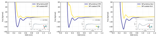 Figure 6 compares PMF of ASP, CYM, and GLU in pristine form and coated form of ZnS nanoparticle. The adsorption strength of these biomolecules decreased strongly by coating the nanoparticle with PMMA. The RDF profiles of biomolecules to 3-MMA monomer have no peak and show the least affinity of these anionic biomolecules to the polymer (Figure S4 of the Supporting Information). The number density profile of PMMA in Figure 7 shows that there is a sharp peak at around 0.19 nm, which corresponds to oxygen atoms of PMMA binding to zinc atoms and occupying these binding sites hindering oxygen atoms in ASP and GLU and sulfur atom of CYM to bind directly to the surface. The PMFs show a minimum around adsorbing distance even for coated surface, but they have a positive value due to the need for adsorbing molecule to displace oxygen atoms of PMMA, and this causes the adsorption energy to decrease dramatically.
