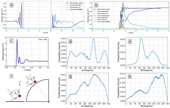 Solvation properties of ZnS surfaces: (a) The density profile of water, Na, Cl, and PMMA around pristine (left part) and coated ZnS (110) slab surface (right part), the position of the outmost Zn atoms are shown as vertical dashed lines; (b) density profile of water, Na, Cl and PMMA relative to the center of mass of pristine (solid lines) and coated (dashed lines) ZnS nanoparticles; (c) Density of oxygen atoms of water molecules around the pristine nanoparticle with respect to the distance to the nearest surface atom of the nanoparticle; (d,e) Probability density of and angles with respect to the z-axis (perpendicular to the surface of the slab) in the pristine slab; (f) visual representation of and angles representing the orientation of the water dipole moment and the water OH bonds, respectively, in a slab (left) and nanoparticle (right); (g,h) Probability density of and with respect to the radial direction of the pristine nanoparticle.