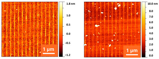 It is well known that multipulse irradiation at specific fluences causes LIPSS patterns. On Si, low-spatial-frequency LIPSS (LSFL) with a period corresponding to the laser wavelength develop perpendicular to the laser polarization [11]. In Figure 7, it can be seen that this is also the case when irradiating the surface with an interference pattern instead of an unstructured beam. If the polarization is parallel to the line structure caused by two-beam interference, the LIPSS can develop unhindered with an orientation perpendicular to these lines (and to the polarization). They have, as expected, a period of about 250 nm, comparable to the laser wavelength of 248 nm. If the polarization is perpendicular to the line structure, the preferred LIPSS orientation would be parallel to this interference line structure. Since the periods of 350 nm and 250 nm do not match with each other or with one of their harmonics, both structure formation mechanisms disturb each other, and the resulting pattern becomes blurred.