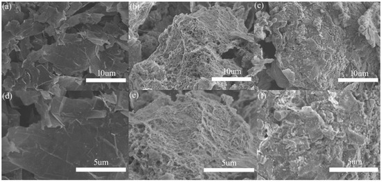 SEM micrographs of (a,d) pure graphene, (b,e) Al2O3@Graphene–CTAB, and (c,f) Al2O3@Graphene–NCTAB.