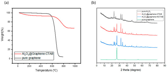 (a) TGA of pure graphene and Al2O3@Graphene–CTAB. (b) XRD of pure graphene, pure Al2O3, Al2O3@Graphene–CTAB, and Al2O3@Graphene–NCTAB.