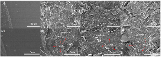 Figure 5a,e display the cross-sectional SEM images of pure epoxy, exhibiting a very smooth surface. In contrast, Figure 5b–d,f–h showcase the cross-sectional SEM images of epoxy composites filled with 10, 20, and 30 wt% Al2O3@Graphene–CTAB, respectively. At lower magnification, it is evident that the graphene fillers were uniformly dispersed throughout the epoxy matrix, which can be attributed to the presence of the surface coating. At higher magnification, a dense Al2O3 layer can be observed on the surface of the graphene sheets. Notably, Figure 5f clearly illustrates the well-structured coating, effectively isolating the graphene sheets and forming an insulation system consisting of the graphene–Al2O3 layer epoxy matrix.