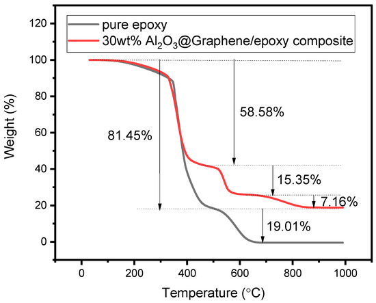 In order to characterize the actual proportion of components in the composites, the TGA curves in air condition were also studied. The TGA curve of pure epoxy resin in Figure 6 shows that the weight loss was 81.45% from 78 °C to 497 °C and 19.01% from 497 °C to 692 °C, respectively. It can also be seen from Figure 6 that the 30 wt% Al2O3@Graphene-filled epoxy composite had a thermal weight loss of 58.58% and 15.35% at 484 °C and 617 °C, respectively, which corresponds to the thermal weight loss of pure epoxy. In addition, there was a 7.16% thermal weight loss at 831 °C, which corresponds to the partial weight loss of graphene. As is shown in Figure 4a, the Al2O3-coated graphene started to lose thermal weight at 549 °C, indicating that there was also the decomposition of the filler before 617 °C. After heating to 1000 °C, the pure epoxy sample was almost completely burnt, while the 30 wt% Al2O3@Graphene-filled epoxy composite still had 18.76% residue. The quantity of the remaining white Al2O3 powder was consistent with the proportion of the input amount.