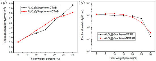 From Figure 7a, the TC of the composites increased approximately linearly as the filler content increased gradually. The TC of the pure epoxy resin was 0.2 W m−1 K−1, and the TC of the composite with 30 wt% filler reached 0.97 W m−1 K−1. Comparing the two sets of Al2O3@Graphene–CTAB and Al2O3@Graphene–NCTAB-filled epoxy composites, no significant difference of TC value can be noticed at low filler loading levels. Only at 30 wt% loading did the composite with CTAB show a significantly higher TC than that without CTAB. Al2O3 without surfactants in composites cannot form a net-like structure coating, as shown in Figure 2f. The uniform net-like Al2O3 coating structure formed under the action of CTAB is very beneficial to maintain the dispersion of Al2O3@Graphene, as well as the insulative performance of composites.