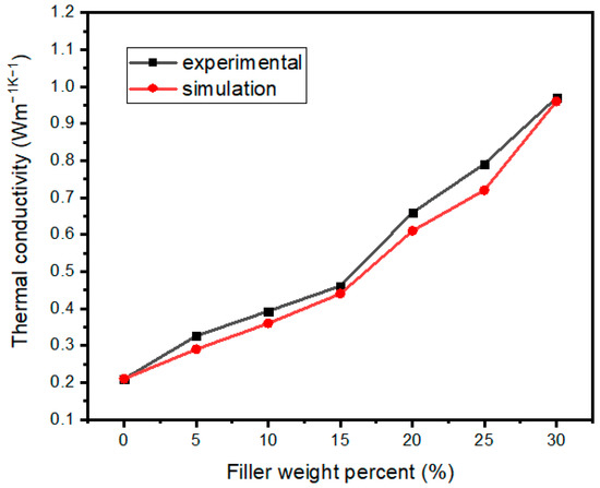 Figure 9 shows the comparison of TC obtained by simulation and tests. The simulation results were obtained by extracting the X-direction heat flow of each node in the heat flow field and calculating it according to Fourier’s law after averaging. It can be seen from Figure 9 that the simulation results were very close to the experimental results.