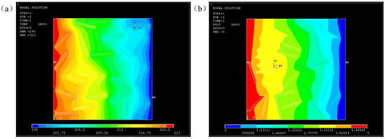 Simulated results of Al2O3@Graphene–CTAB-filled epoxy composites with (a) temperature field and (b) voltage field.