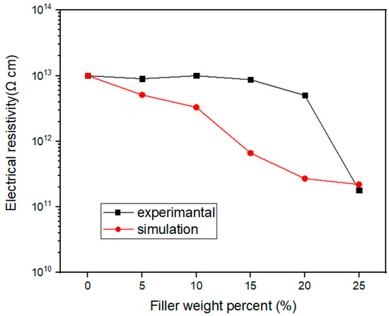 Figure 11 represents the comparison of electrical resistivity obtained by simulation and tests. On the whole, the decreasing trend of electrical resistivity with the increase of filler loading was similar for the simulation and the tests. The electrical resistivity decreased more quickly in the simulation than in the tests when the filler loading was below 20 wt%. The percolation effect of electrical resistivity seemed to appear for the tested results at 20 wt% filler loading. This is because in the actual conduction behavior, a conduction path will be formed, and the resistivity will decrease significantly when the filler loading increases to a threshold value. However, there is no threshold phenomenon in the simulation results, which depends on the model established.