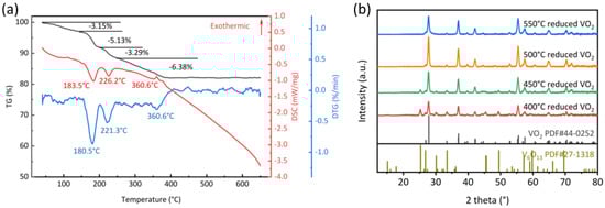 (a) TG-DSC pattern of the V2O5 and NH4HCO3 raw mixture and (b) XRD pattern of VO2 powders annealed at different temperatures.