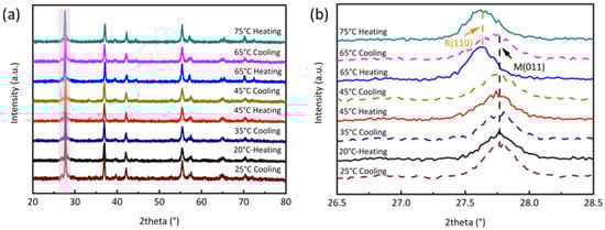 To observe the metal-insulator transition, P-VO2 was characterized through in-situ XRD technique, and the results were shown in Figure 2a,b, and Figure 2b was the enlarged view of the pink area in Figure 2a. The VO2 stayed the monoclinic structure below 45 °C, and the main peak (27.76°) corresponded to the (011) crystal plane of VO2(M). When the temperature rose above 65 °C, the peak shifted to 27.63°, revealing that the VO2 crystals had transferred to the rutile phase, featured with the (110) crystal plane of VO2(R) (PDF #73-2362). This phenomenon suggested that the phase transition temperature of P-VO2 ranged between 45 °C and 65 °C. This was in agreement with previous reports [] for VO2 particles. When the VO2 particles cooled down from 75 °C to 65 °C, VO2 crystals transited back to monoclinic structure from rutile structure. This helped obverse the evident and reversible MIT behavior between VO2(M) and VO2(R) in the previous report []. Furthermore, the phase transition temperature of the cooling stage was inconsistent with that of the heating stage, confirming the thermal hysteresis loop feature of VO2 in the phase transition stage. It was the MIT behavior that made VO2 a promising material for smart windows.
