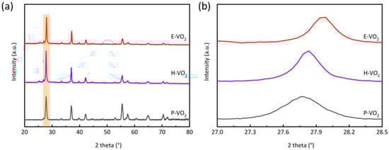 (a) XRD pattern of P-VO2, H-VO2, and E-VO2 powders and (b) enlarged view of the diffraction angle ranging from 27.0° to 28.5°.