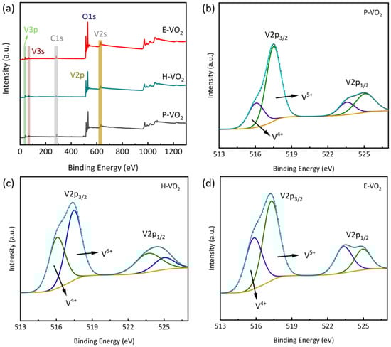 With the goal of further determining the effect of the quenching process on VO2, the XPS technique was used to identify the chemical environment of elements, and the results were presented in Figure 4. Regarding the C1s peak at 284.80 eV as the calibration position, the full spectrum (Figure 4a) illustrated the existence of vanadium and oxygen in all the P-VO2, H-VO2, and E-VO2 powders according to the V2p and O1s peaks. The V2p peaks were analyzed by Avantage of Thermo Scientific. In addition, Shirley background subtraction was employed to diminish the influence of heightened peaks due to signals from electrons undergoing inelastic scattering during the XPS characterization, ensuring a convincing quantification analysis of the peaks. As the high-resolution pattern for V2p shown in Figure 4b to d, both the V2p3/2 and V2p1/2 spectral peaks were significantly asymmetrical and each was split into two peaks, which implied that the vanadium of all the VO2 samples involved two different chemical states, corresponding to V4+ (The fitted purple curve) and V5+ (The fitted green curve), respectively. V5+ owing to V2O5 consisted of V2p3/2 at 517.5 eV and V2p1/2 at 525.0 eV. The gap between the V2p3/2 orbital and V2p3/2 orbital was 7.5 eV, which is in line with previous work []. Additionally, it is supposed that the existence of V5+ was caused by partial oxidation when the VO2 particles were exposed to air []. The V4+ attributed to VO2 was made up of V2p3/2 at 516.2 eV and V2p1/2 at 523.7 eV. In addition, the V2p3/2 of P-VO2 was most occupied with V5+, and V4+ only accounted for a small proportion. Comparably, the V4+ in the V2p orbitals of H-VO2 in Figure 4c showed the highest percentage, followed by E-VO2 in Figure 4d, and finally, the P-VO2 declared the least V4+ content in Figure 4b. Such results could be attributed to the surface lattice distortion of H-VO2 and E-VO2.