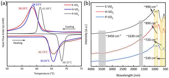(a) DSC curve and (b) FT−IR spectrum of P-VO2, H-VO2, and E-VO2 powders.