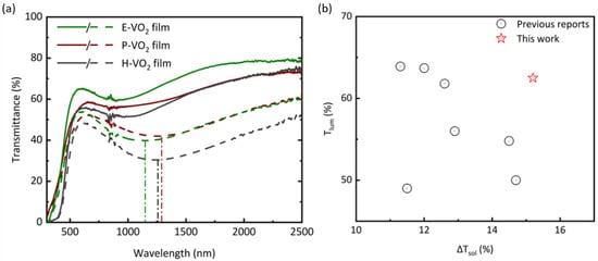 (a) Transmittance spectrum comparison of VO2 films and (b) thermochromic performance comparison between this work and previously reported VO2 nanocomposite films.
