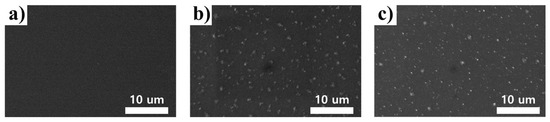 Figure 2 shows the surface morphology of Metal (silver) thin films treated with plasma process conditions. At lower powers (50 W and 100 W), the randomly distributed cluster structures were not clearly distinguishable. To better observe and differentiate the cluster distribution, SEM images were obtained at 200 W over different treatment times. Figure 2a–c presents the planar SEM images of the Metal with plasma treatment times of 0, 60, and 150 s, respectively. As observed in Figure 2, exposure to the etching gas resulted in the formation of randomly distributed cluster structures. Moreover, the cluster structures decreased in size with increasing plasma treatment time. For these reasons, these randomly formed cluster structures were deemed suitable for light extraction, minimizing optical losses through scattering.
