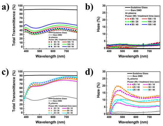 Figure 3 shows the total transmittance and haze characteristics of DsMD-based transparent electrodes with and without scattering structures. All samples were fabricated on bare soda-lime glass substrates. The bare DMD without scattering structures exhibited a total transmittance of less than 40% and a haze close to 0% in the visible wavelength range. DsMD samples with different plasma gas types and process conditions demonstrated varying total transmittance and haze characteristics. As shown in Figure 3a,b, DsMD structures with thin metal layers treated with Ar-plasma exhibited the maximum total transmittance 52.1% and maximum haze 2.6% at 550 nm, with higher plasma power resulting in improved total transmittance. In contrast, as shown in Figure 3c,d, DsMD structures with thin metal layers treated with O2-plasma showed a total transmittance of over 70% in the visible wavelength range, with lower plasma power leading to increased total transmittance and improved haze characteristics. The DMD structure with thin metal layers treated with O2-plasma demonstrated the maximum total transmittance value 76.2% (O2-p/50 W/40 s) at 550 nm. Therefore, DMD transparent electrodes with thin metal treated by plasma are considered suitable as light extraction structures, minimizing light losses due to scattering. Haze was calculated using Equation (1).