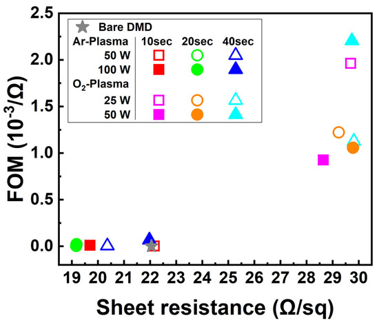 Figure 4 shows the plotting of sheet resistance and figure of merit (FOM) as functions of the plasma to evaluate the characteristics of DMD-based transparent composite electrodes with integrated scattering structures. The FOM was calculated using Equation (2) (FOM units, 10−3/Ω) [28].