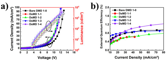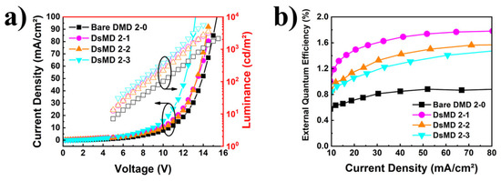 Comparison of OLED devices with DsMD structures incorporating thin metal subjected to O2-plasma dry etching at different powers. (a) Current density-voltage-luminance characteristics of OLEDs, (b) EQE as a function of current density characteristics of OLEDs.
